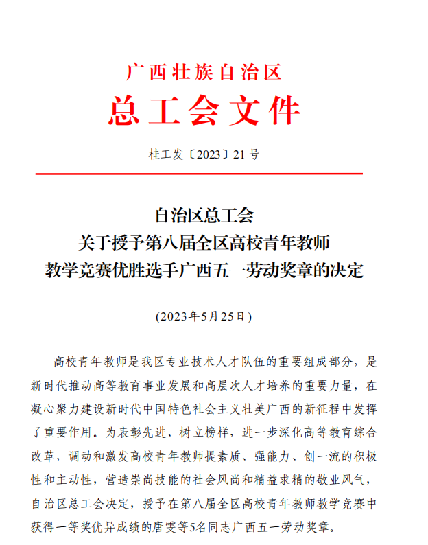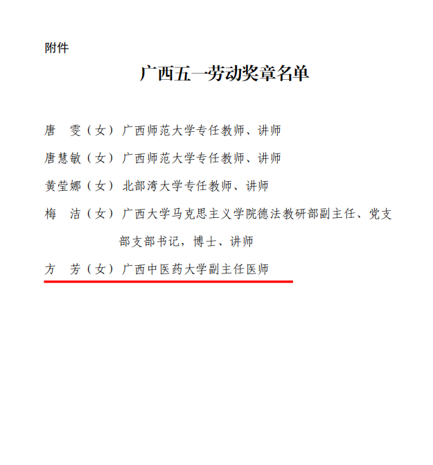 近日,根据《自治区总工会关于授予第八届全区高校青年教师教学竞赛优胜选手广西五一劳动奖章的决定》,鸭脖第一临床医学院方芳老师荣获2023年广西五一劳动奖章。