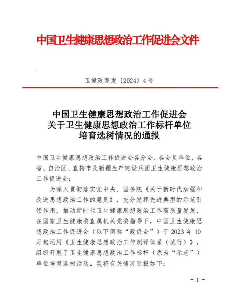 近日,经国家卫生健康委直属机关党委审定,中国卫生健康思想政治工作促进会印发了《关于卫生健康思想政治工作标杆单位培育选树情况的通报》,经过实地调研和集中审核筛选,选树了133家卫生健康思想政治工作标杆单位,一附院获评全国卫生健康系统“思想政治工作标杆单位”。