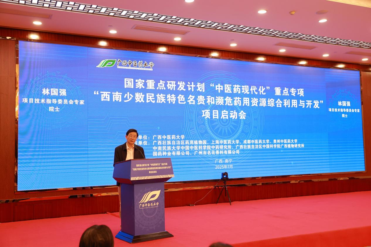 启动仪式上,莫锦荣致辞表示,项目立项是学校“有组织科研”的重要实践,将全力保障标志性成果产出。蔡朝亮强调,项目立足广西丰富药用资源,是区域中医药产业突破的关键,科技厅将协同推动成果转化。苏钢强在线上指出,项目需深化中医药传承创新,为国家战略贡献智慧。吕泽要求聚焦产业需求,强化规范管理,确保成果落地。濮润提出建立高效协同机制,突破关键技术瓶颈,推动中医药高质量发展。