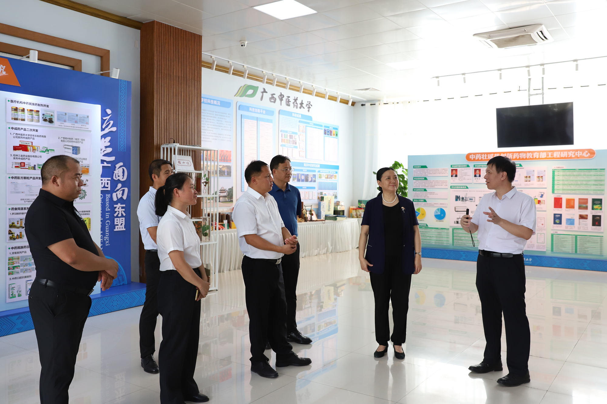 座谈会前,韦文周一行参观了中医药科学实验中心,了解学校在科研方面取得的成果,尤其是罗汉果在中医药领域的研究应用情况。