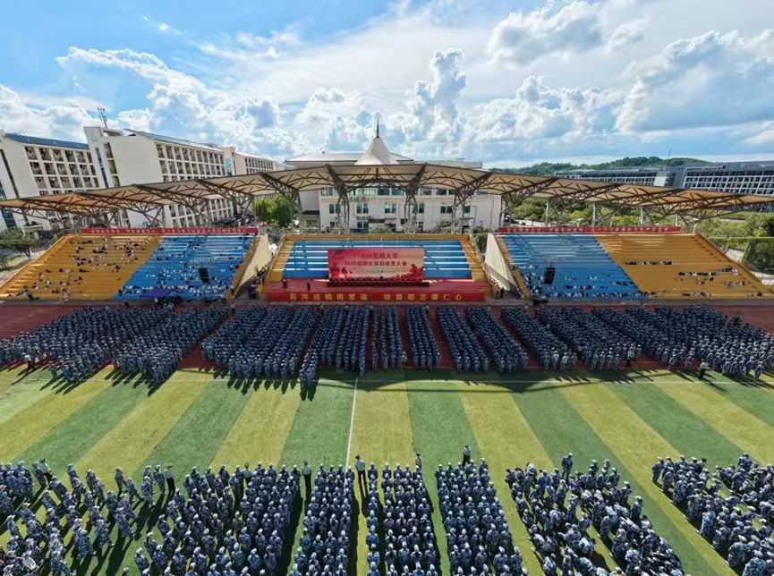 9月12日下午,学校2025级新生军训动员大会在仙葫校区足球场举行。学校党委常委、副校长何刚亮,承训单位陆军某部参谋长陈为和全体军训教官,学校各职能部门和学院负责人,新生辅导员代表及2025级本专科全体新生3000多人参加本次大会。