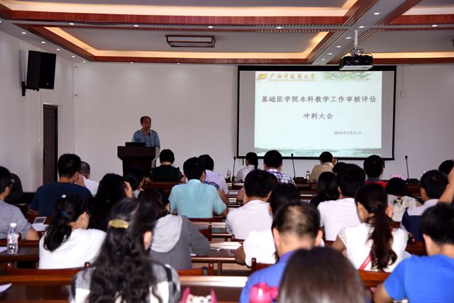 2016年5月31日下午,距离教育部对鸭脖本科教学工作审核评估仅有13天,为了更好的推进落实本科教学工作审核评估工作,基础医学院召开本科教学工作审核评估冲刺会议,戴铭副校长到场指导,基础医学院全体教职员工和部分学生代表参加会议。