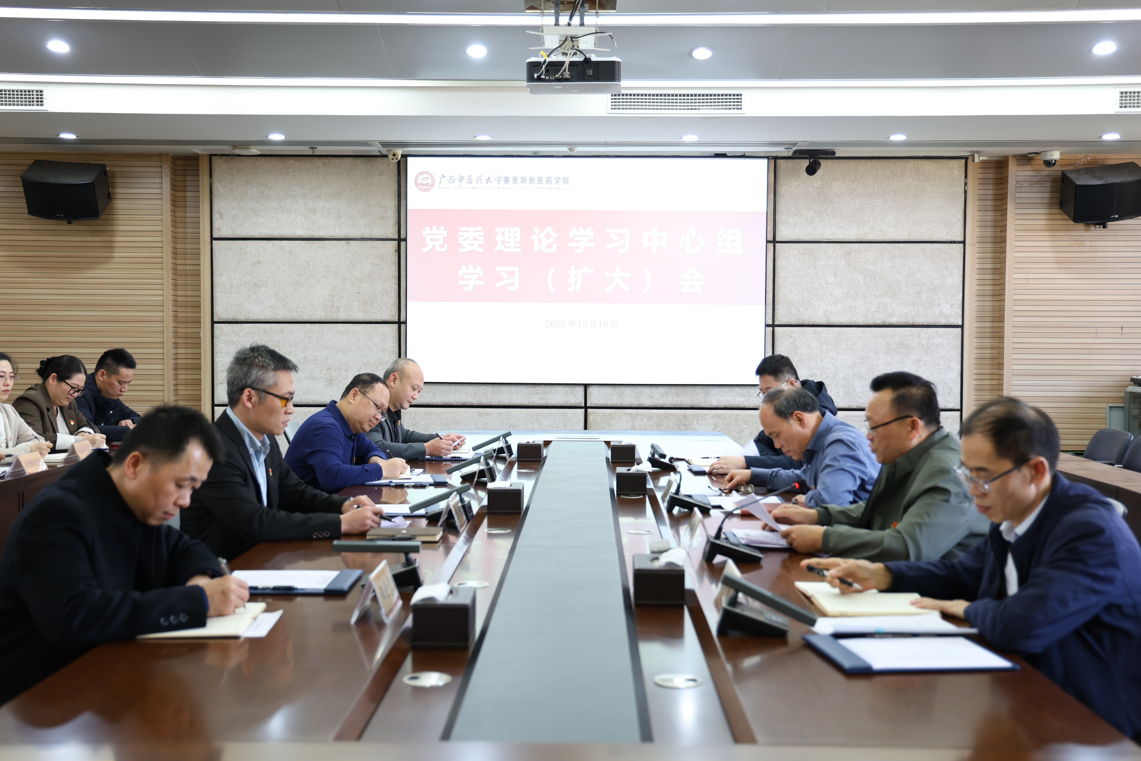 12月18日下午,赛恩斯新医药学院举行党委理论学习中心组学习(扩大)会,学校党委副书记邹勇到会指导,党委常委、宣传部部长蓝开宝列席旁听,赛院党委理论学习中心组成员、各党总支书记参加学习,赛院党委书记肖华业主持会议。