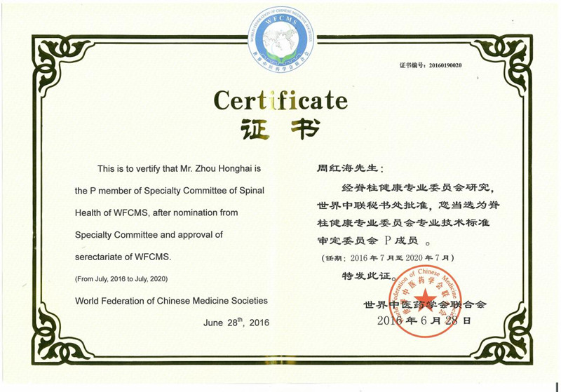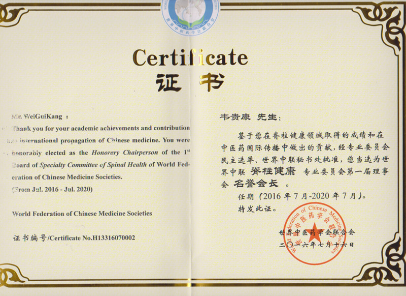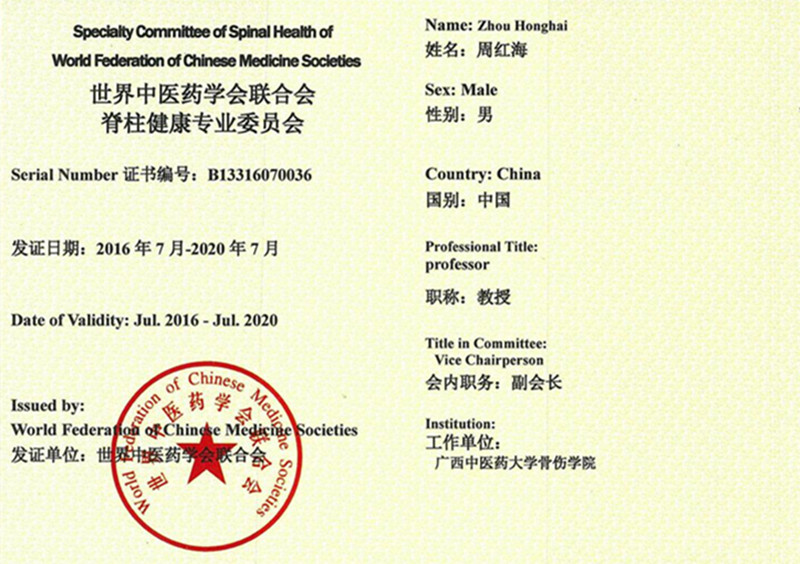 会后,鸭脖中医骨科专家韦贵康教授被聘为该专业委员会名誉会长,周红海教授为第一届副会长与专业技术标准审定委员会成员,陆延医师、田聪医师被聘为会员,经专业委员会网上七天公示无异议,由世界中医药联合会寄来证书。