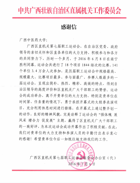 中共广西壮族自治区直属机关工作委员会发来感谢信 来源:体育部 作者:吴国天 日期:2016-09-07 点击数: 次 分享到: 日前,中共广西壮族自治区直属机关工作委员会在给鸭脖的感谢信中盛赞鸭脖太极拳表演队,认为鸭脖在区直机关第七届职工运动会开幕式上表演的太极拳通过整齐划一的动作、良好的精神风貌,完美诠释了运动会“强体质、展风采、增合力、促发展”的主题,赢得了区直机关广大干部职工的赞誉。 感谢信 鸭脖太极拳表演队在区直机关第七届职工运动会开幕式上表演 鸭脖太极拳表演队 打印正文 关闭本页