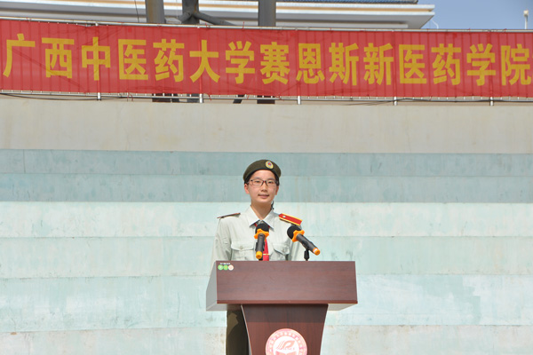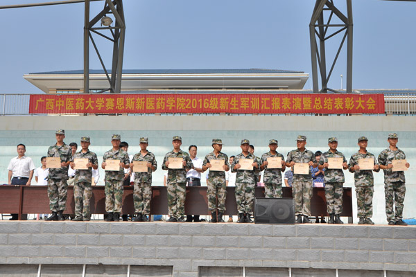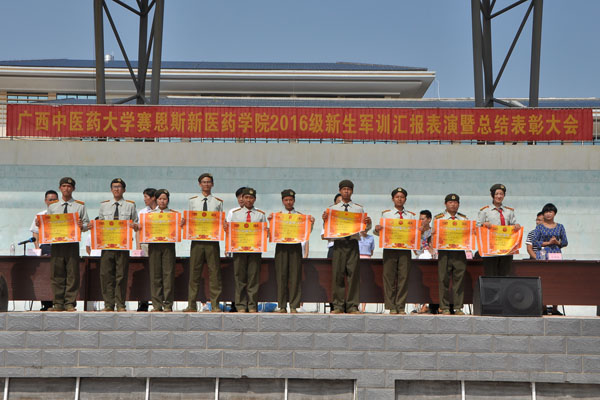 赛恩斯新医药学院徐方明书记在会上讲话,向全体教官表示感谢,向参与、组织本次军训工作的辅导员老师表示慰问。徐书记指出,今年是红军长征胜利80周年。长征是中国共产党领导全国人民谱写的一部惊心动魄、气壮山河的壮丽史诗,希望同学们铭记和弘扬长征精神,以这次军训为起点,继承和发扬部队的优良传统和作风,敢于吃苦,艰苦奋斗,增强团队和集体意识,把这次军训的成果融入到今后的学习、生活、工作中,以激励自己为建设祖国刻苦学习,早日成长为报国有志、建国有才、效国有力的新时期优秀人才。青秀区武装部副部长宋小武代表参训部队领导讲话,他表示此次军训在部队教官的严格要求下,同学们能严格遵守部队纪律,认真完成各项训练科目,真正以军人的作风和素质要求自己,在体能上有所提高,更重要的是培养了团队精神、集体意识和吃苦耐劳的精神。同时,他希望广大同学们继续发扬和保持在军训中学到的良好作风,真正担负起新时代大学生的责任,把军训成果转化为优良的学风、校风,在今后的学习生活中争取更大的成绩和荣誉。2016级护理学2班王慧同学代表2016级新生发言,在发言中,她道出了所有新生共同的感受:军训虽然苦,但“宝剑锋从磨砺出,梅花香自苦寒来”,同学们用艰苦训练换来了严明的纪律意识和顽强的意志。梁天坚副院长在会上宣读了表彰决定,本次军训分别评选出优秀连队10个,优秀教官14人,军事训练标兵26人,随后分别对优秀连队、优秀教官和优秀训练标兵进行了表彰,最后师生齐唱雄壮奋进的校歌——《弘毅曲》,2016级新生军训汇报表演暨总结表彰大会落下了帷幕。