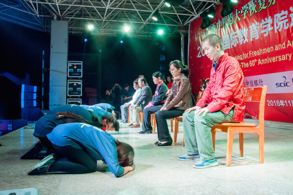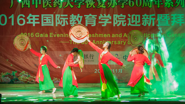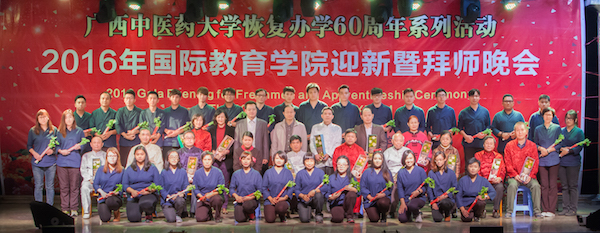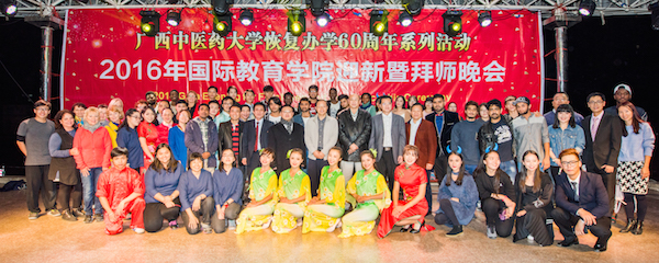 11月12日晚7:00,作为学校恢复办学60周年系列活动之一,2016国际教育学院迎新晚会暨拜师晚会在学校明秀校区足球场隆重举行。学校戴铭副校长、马来西亚驻南宁总领事馆黄奕瑞总领事、华尔特·费南迪副总领事、越南驻南宁总领事馆黎英俊领事、国际教育学院蒋基昌院长、韦文朗副院长、学校学工处、团委、招就处等各单位、各二级学院领导老师、2013级国际传统中医班全体带教导师等出席了晚会。