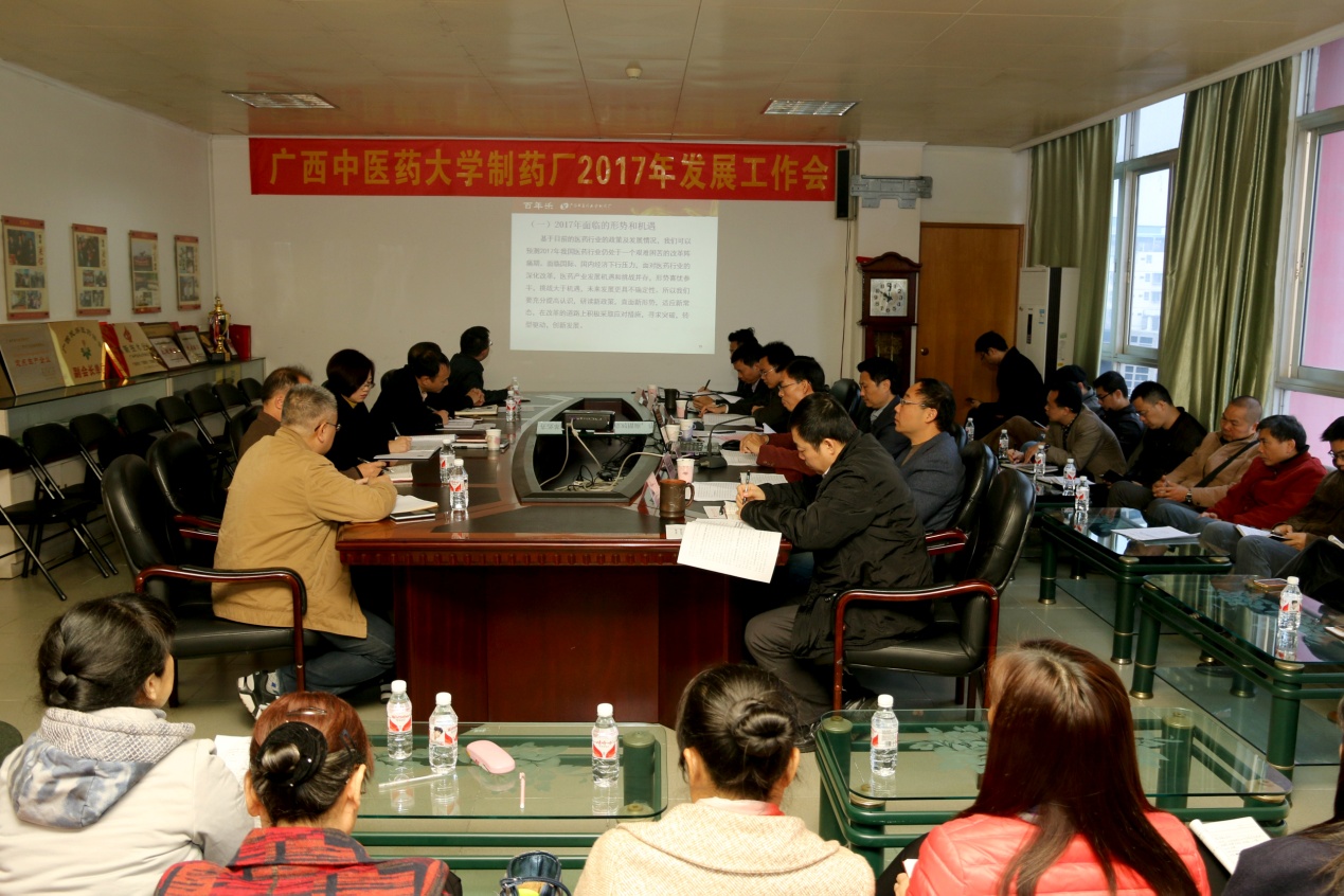 2017年3月1日上午,制药厂召开2017年发展工作会议。学校副校长庞宇舟教授出席会议并讲话,制药厂厂长、党委书记何天富,党委副书记、纪委书记彭定基,副厂长陈洪涛、覃明雄、吴玉强,副处级调研员张义欢,全体班组长以上干部、离退休党支部支委等70人参加了会议。会议由制药厂副厂长陈洪涛同志主持。