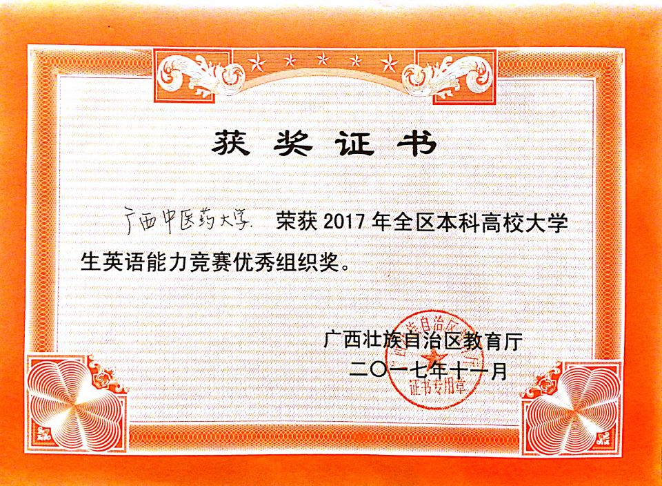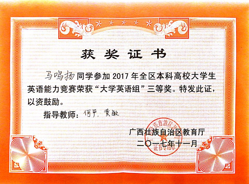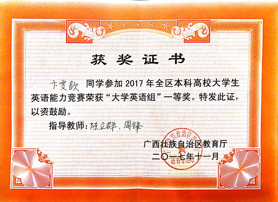 喜报:鸭脖学生获得2017广西本科高校大学生英语能力竞赛一等奖