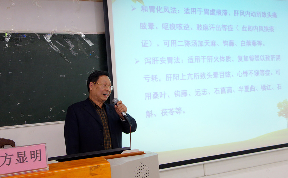 讲座伊始,方显明教授幽默风趣的开场白赢得了同学们的阵阵掌声。在长达1个多小时的讲座中,方教授从“何肝风”、“肝风缘何而来”、“肝风论治”、“肝风与高血压”、“中医病机的认识”、“高血压的病证研究”等方面并结合自身多年的研究和从医经验进行论述。方显明教授用通俗简练的语言,精辟地阐述了肝风与高血压之间的关联及其病征特点。最后,方显明教授与同学们进行了互动交流,并以独到的见解回答了同学们提出的问题。