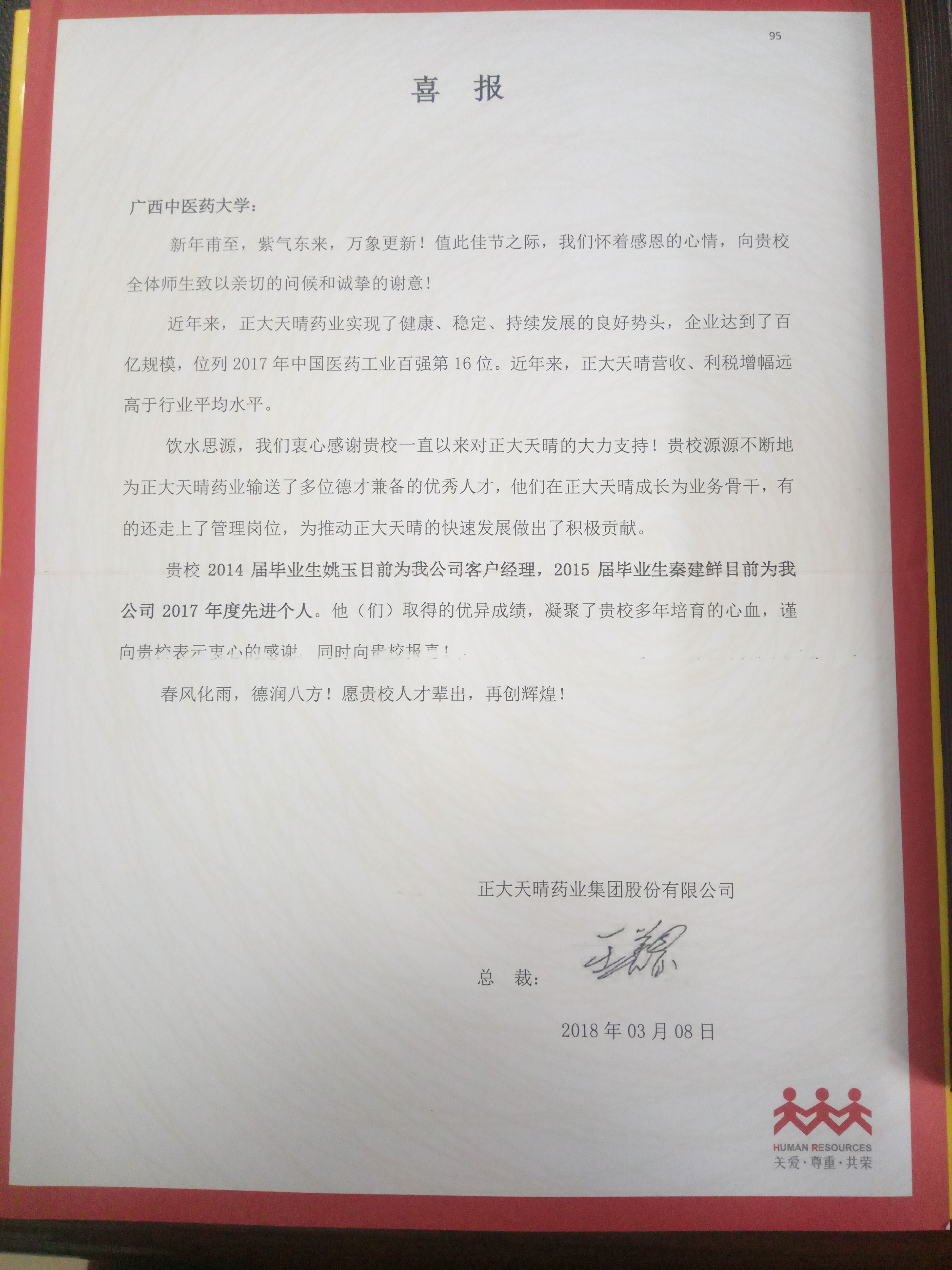 喜报上提到了鸭脖毕业生在他的企业工作中,有的已经成长为业务骨干,有的走上了管理岗位,其中重点报告了2014届市场营销本科专业毕业生姚玉和 2015届中药学毕业研究生秦建鲜在公司工作表现及取得的优异成绩,并对鸭脖在今后人才培养给予了厚望。