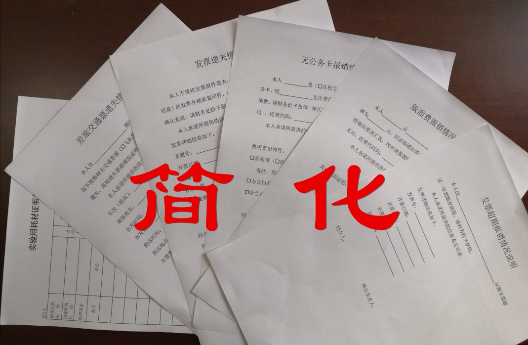 3.简化手续,破解手续繁。针对报销常见问题,设置统一模板,简化差旅交通票遗失、发票遗失、无公务卡报销、版面费报销、发票超期、实验用耗材证明等6种情况的报销手续。