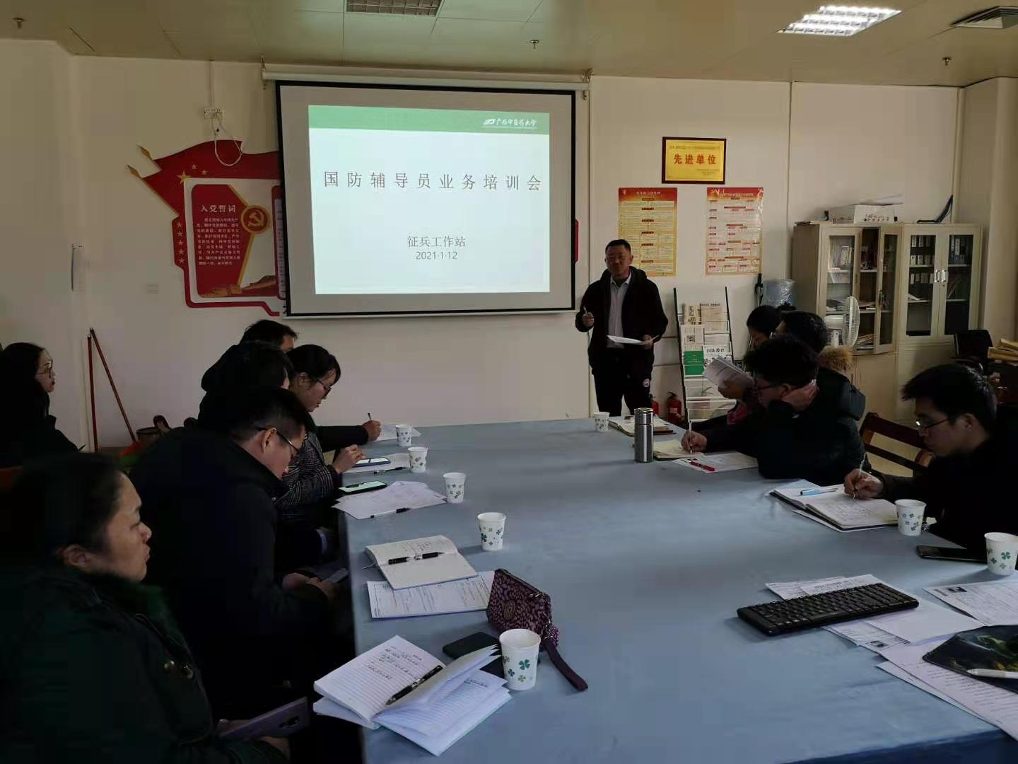 为做好学校2021年度征兵工作,锻造一支“政治强、业务精、作风正、纪律严、工作实、服务优”的国防辅导员队伍,进一步提升鸭脖兵员征集工作的水平。1月12日下午,武装部举办征兵工作业务培训会,各学院及附属单位的国防辅导员参加此次会议。