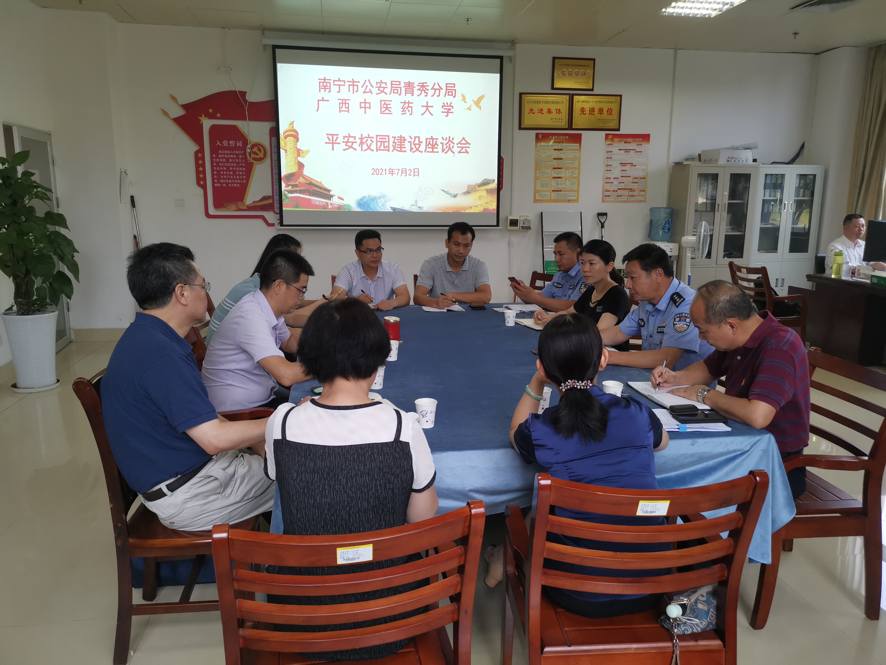 为落实全国、全区安全生产电视电话会议精神和教育部关于进一步加强校园安全工作的要求,最大限度减少校园事故的发生,为建党百年营造良好氛围,7月2日,鸭脖与南宁市公安局青秀分局在学校仙葫校区图书馆102室召开平安校园建设座谈会。青秀分局经文保大队张文超副大队长带相关人员到会进行座谈,鸭脖党委办公室、学生工作处、工会、国际合作与交流处、赛恩斯新医药学院等相关部门以及学校物业等负责安全工作人员参会交流。会议由武装保卫部部长张春主持。