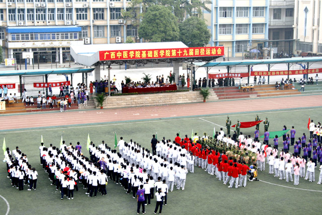 2009年11月8日,广西中医学院基础医学院第十九届大学生田径运动会在学院运动场隆重举行。学院学工部(处)部(处)长冼锦华,校团委书记李月发、体育部主任韦军湘、副主任石荣群,基础医学院党委书记何清平、院长戴铭、副书记韦海英等领导以及各二级学院分团委书记和学生会代表出席了此次运动会开幕式。