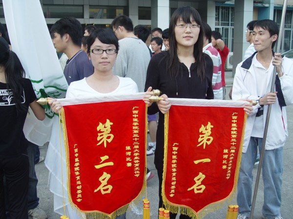 4月27日,广西中医学院举行第三十二届大学生体育文化节拔河比赛闭幕式。其中赛恩斯新医药学院﹑药学院和第一临床医学院分别获得本次拔河比赛的一﹑二﹑三名。出席本次闭幕式的领导有广西中医学院体育部主任韦军湘教授,广西中医学院体育部副主任石荣群老师。