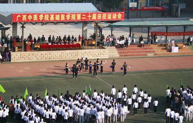 2010年10月31日,广西中医学院基础医学院第20届大学生田径运动会在田径场隆重举行。广西中医学院体育部韦军湘主任,广西中医学院学工处冼锦华处长,广西中医学院团委李月发书记,广西中医学院团委王春花副书记,基础医学院党委何清平书记、韦海英副书记、张煜副院长,各二级学院分团委书记及校团委,校学生会、各二级学院学生会代表及各班班主任参加了本次运动会开幕式。开幕式由基础医学院党委韦海英副书记致辞,由学工处冼锦华处长宣布运动会正式开幕。