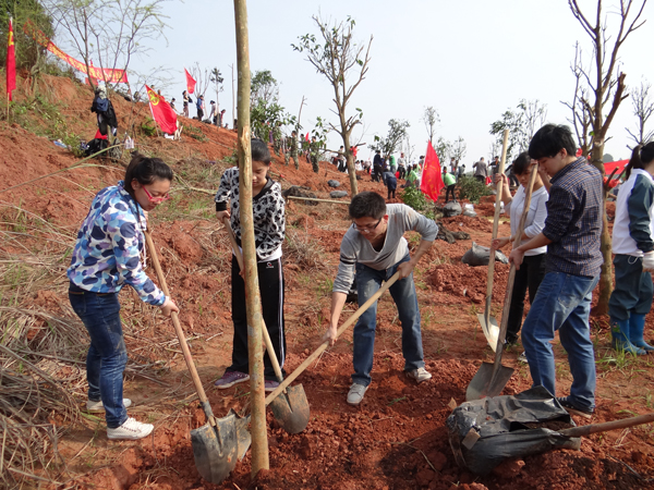 到达目的地,同学们纷纷拿起铁铲、锄头,兴致勃勃地前往植树地点。尽管路途较远,但却丝毫没有打退同学们的兴致。路上随处可见同是前来植树的人们,大家都忙得不亦乐乎,其乐融融。到达了植树地点,在有关工作人员的指导与示范下,同学们马不停蹄地开始了植树工作。尽管烈日当头,纵使汗流浃背,同学们仍然齐心协力,互相配合,不怕苦,不怕累,将一株株木苗伫立起来。挥镐舞锄,干劲十足,很快种下了20棵青葱翠绿的树木,为青秀山增添了一片绿意,使山头焕发出一片盎然生机。