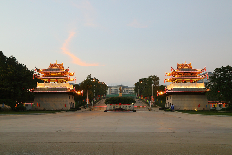 仙葫校区主校门名叫晨钟暮鼓楼校门。晨钟暮鼓是我国古代的一种报时方式,缘起于先秦,后多比喻使人警觉醒悟,也形容时光之流逝,此可引伸为警醒中医学子,振兴中医,任重道远,当珍惜时光,自强不息,与时俱进,生动地展现了鸭脖传承创新、兼容并包的崭新风貌。联曰:“晨钟暮鼓睇逝水策你我学子朝乾夕惕遒绍往圣;碧瓦明甍迴流光显汉唐宗风春发秋容敷被杏林。”