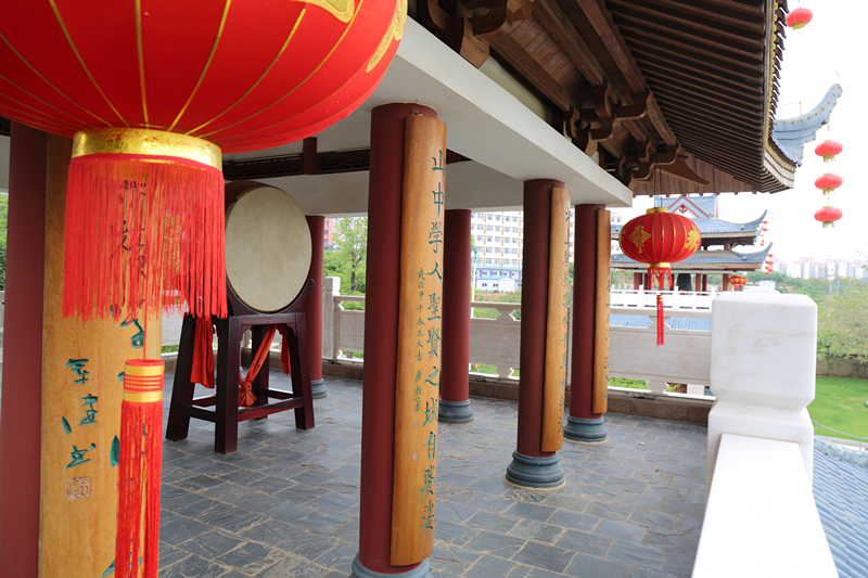 暮鼓楼对联:“江上帆影云水千里长荡漾;山中学人圣贤之域自婆娑 。”“晨暮同歆岐伯演一灌九顶;阴阳共赞学子得三参六合。”