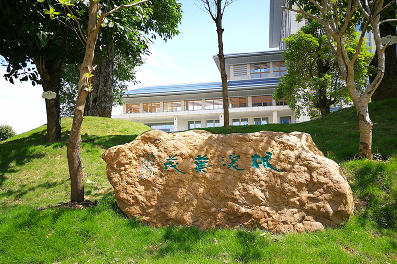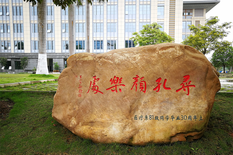 二楼大堂的地面上铺设有太极阴阳鱼图案,墙上是一幅由晨钟暮鼓楼校门及邕江组成的壁画,联曰:“月明风清更有半江渔火引目去,日曦气紫且迎一天云霞扑面来”。道出了位于邕江之畔的仙葫校区,依山傍水,环境优雅,在这里源远流长的华夏文化与博大精深的中医文化融为一体,很好地体现出学校的办学理念和校园文化特色,正是潜心学习和兴办大学的绝佳场所。
