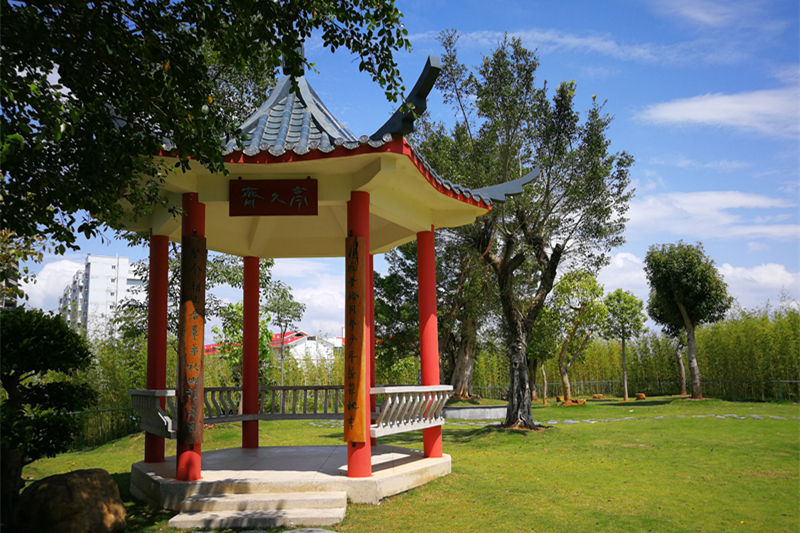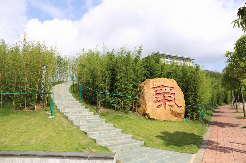 竹林东临亲亲路,北融齐久亭,南接五味林,西眺阿平湖。竹林东坡起处,一块巨石迎面而来,刻有一“氣”字点缀,出自名家刘炳森手笔。“氣”上翠竹䈡笼,生机盎然;竹海荡漾,又烘托出坡上的图书馆楼顶,错落有致;再往上,便是蓝天白云,悠然去来。伫立亲亲路边,将眼望去,“氣”、竹海、碧瓦明甍、蓝天白云,浑然天成,重叠三度景深,美轮美奂。
