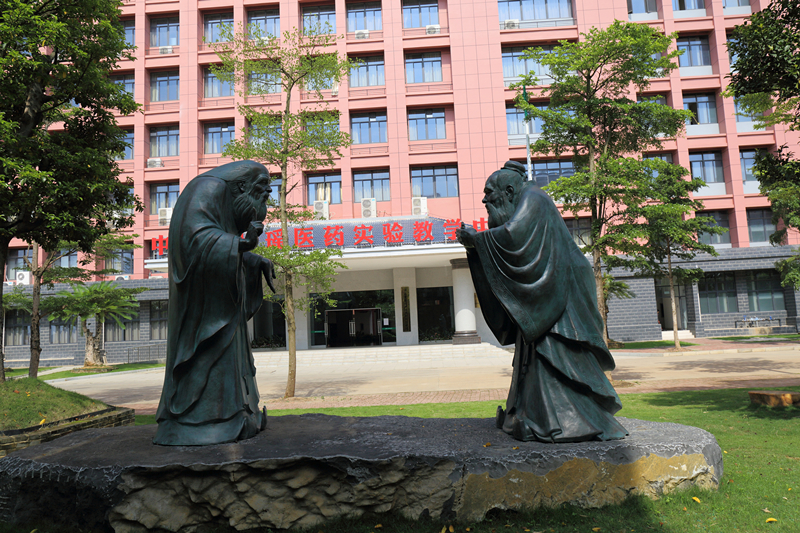 大型青铜雕塑作品《问道》位于仙葫校区教学楼西侧。该作品由广西美协主席、我国著名雕塑家石向东教授及其团队创作。《问道》匠心独运地表现了老子、孔子两位中国先圣会晤的形象。