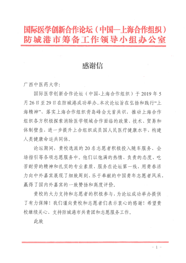 鸭脖研究生志愿者圆满完成国际医学创新合作论坛(中国—上海合作组织)志愿服务工作 发布时间:2019-06-12 10:30:56 浏览次数: 次 【字体:小 大】 鸭脖研究生志愿者圆满完成国际医学创新合作论坛(中国—上海合作组织)志愿服务工作 国际医学创新合作论坛(中国—上海合作组织)于2019年5月26-29日在防城港市成功举办。受主办方邀请,鸭脖经过层层选拔,选派了20名研究生参加论坛的志愿服务活动,出色地完成主办方交办的各项服务工作,获得了主办方的高度认可和赞扬。 附件:感谢信 分享到: 【打印正文】