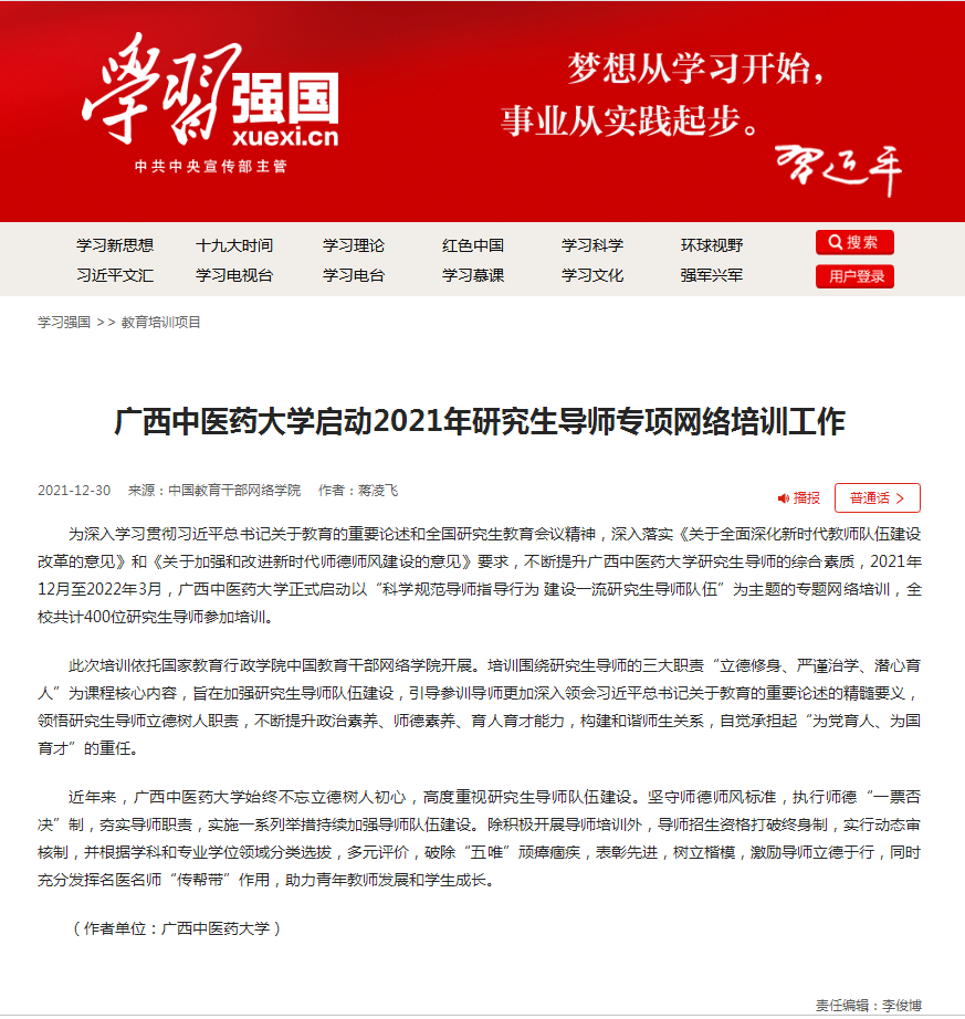 学习强国报道鸭脖研究生导师参加网络专题培训工作 发布时间:2022-01-05 11:02:09 浏览次数: 次 【字体:小 大】 学习强国相关网址链接https://www.xuexi.cn/lgpage/detail/index.html?id=9257803970061045205&item_id=9257803970061045205 分享到: 【打印正文】