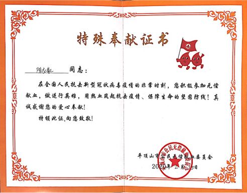 2018级研究生1班陈龙豪在血源告急时积极响应国家号召无偿献血并鼓励亲戚朋友一起为疫情献血。他说:“在今后的工作中,我会不忘初心、牢记使命,以身作则带动团支部人员,形成人人做志愿、人人献爱心的团支部。”