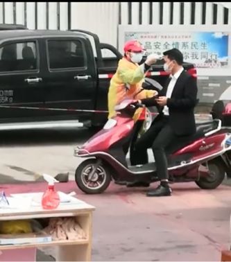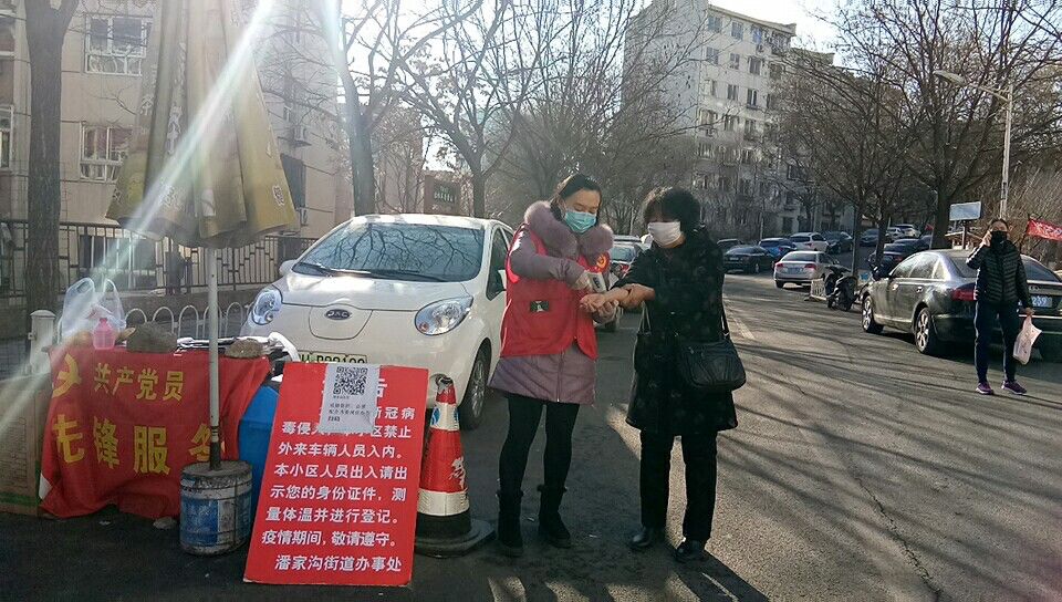 2019级研究生7班王杨坤在社区的入口处检查居民的出入证以及测量每一位进入社区居民的体温。