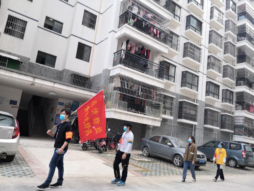 2019级研究生1班韦国信协助社区工作人员宣传防疫政策,巡视街道人员自我防护情况,劝阻外出人员,和谐社区关系。