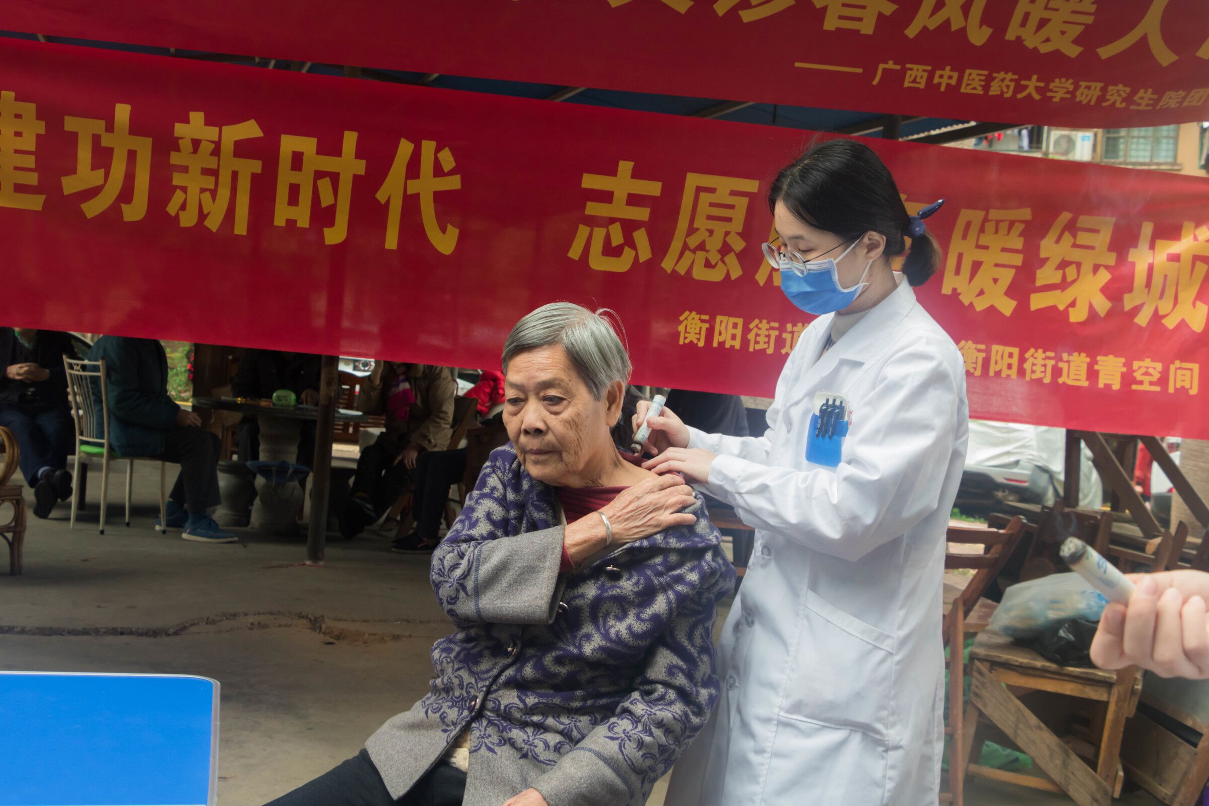 在活动现场中,志愿者们积极热情地为社区居民进行了推拿、艾灸、穴位敷贴、测量血压及健康咨询等,同时志愿者们也耐心地为前来参与的居民答疑解忧,并告知他们定期检查身体的重要性,鼓励老人要树立积极乐观的生活态度,养成健康的生活习惯。而大家脸上挂满着灿烂的笑容就是对志愿者们的肯定。通过义诊活动让广大民众更加充分了解中医药文化,以及充分感受我们新时代大学生送来的温暖。