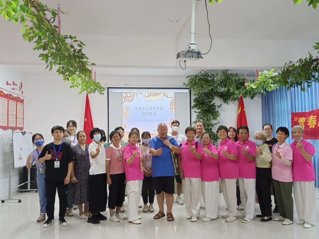 打完八段锦之后志愿者们对老年人进行养生知识的宣讲。首先是养生十六字方针:合理膳食、适量运动、戒烟限酒、心理平衡,再延伸到老年人夏季保健及养生的原则与方法。正所谓民以食为天,养生知识还是以“食”为主,宣讲内容贴近生活,老人们兴致也很高。