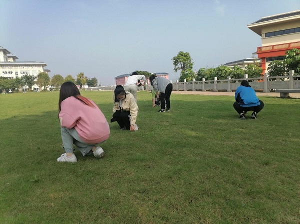 同学们在清理草坪上的垃圾