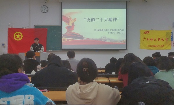 12月1日晚, 2020级药学4班在教学楼2-104教室开展了“党的二十大精神”团日活动。此次活动由团支书黄承鸿主持。