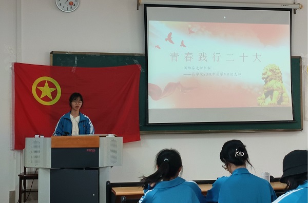 为学习贯彻党的二十大精神,3月14日2020级中药学4班在仙葫校区教学楼2-209教室开展“青春践行二十大”主题团日活动,2020级中药学4班全体同学参与活动,班主任戴忠华老师受邀参加,李玲担任主持人。