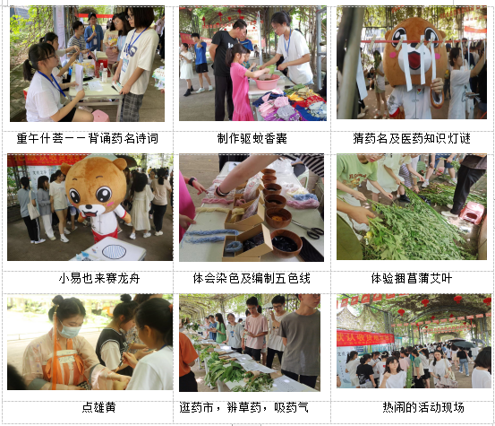 精彩纷呈的云课堂让人受益匪浅,线下活动同样令人流连忘返。上午11点,炮制药事中化支部指导的“相聚壮瑶医药廊,共度端午安康节”端午节特色活动在鸭脖仙葫校区昆弟长廊隆重举行。本次活动共设置了“重午什荟”、“香囊传情”、“文虎之争”、“赛龙舟”、“五彩缤纷线”、“手执艾旗招百福,门悬蒲剑斩千邪”、“点了雄黄酒、“相约药市”等8个特色活动。活动参与涉及各年级学生600余人,参与端午传统文化及民族医药文化知识问答1600余人次,同时吸引了数十名中小学生的积极参与,激发了青少年对中医药的兴趣及中华传统文化的热爱。也让师生在学校感受端午浓厚节日气氛的同时深刻领悟到中华传统文化的魅力,增强了中医药文化自信,为今后投身中医药、民族医药事业、弘扬中华传统文化奠定了坚实的基础。