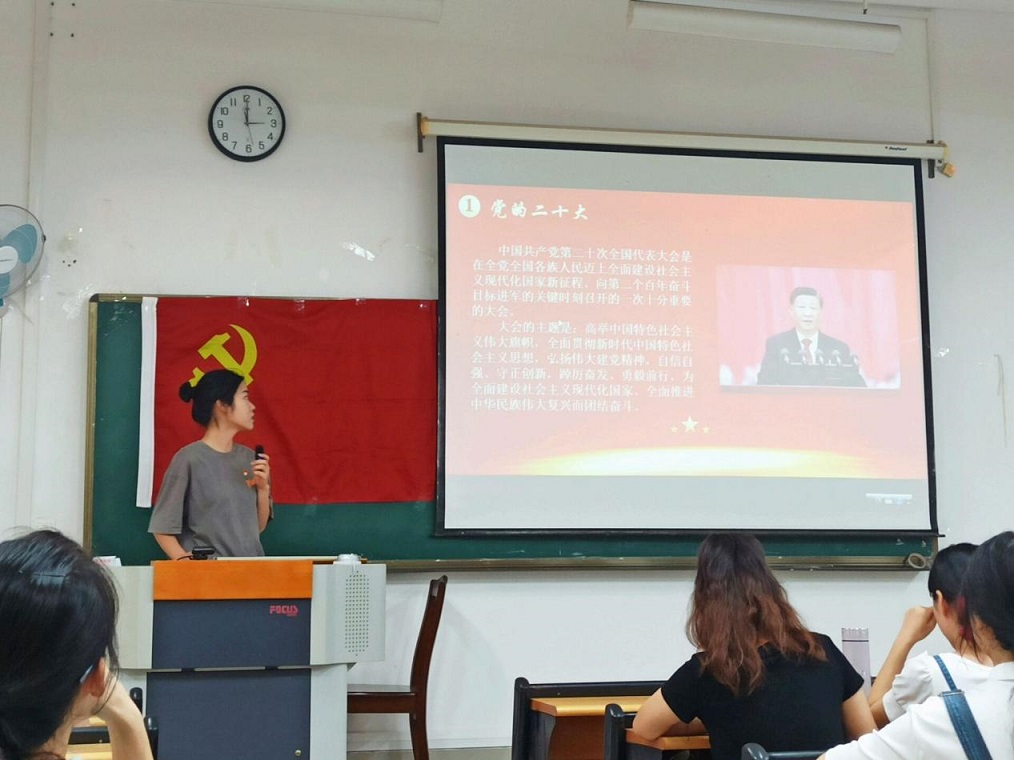 为庆祝中国共产党第二十次全国代表大会胜利召开,10月25日下午,药学院食品学生党支部在仙葫校区1-113教室开展了“青春向党百年路,奋进庆祝二十大”活动。本次活动由党员刘雨婷主持,支部党员、积极分子共同参加。