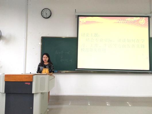 活动伊始,各位发展对象结合自身专业实际,如何在学习、工作、生活中等方面发挥先锋模范作用依次踊跃发言,各抒己见,纷纷表示在日后的学习工作生活中要积极发挥党员的先锋模范作用,积极进取,严于律己,宽于待人,求真学问,练真本领,砥砺奋斗,勇于担当时代责任,争做模范先锋。接下来,参会的两名预备党员同志也在学习、工作、生活等方面如何发挥先锋模范作用进行了经验分享。最后,由支部副书记罗柳丹同志为大家的发言进行总结,并强调作为一名发展对象和党员,不仅要做到以上同志所说的,还要加强组织纪律性,加强党支部意识,党员意识,多学习《习近平关于“不忘初心、牢记使命”论述摘编》;还要处理好人际关系,打下良好的群众基础,按时完成每个季度的思想汇报,提升思想觉悟。