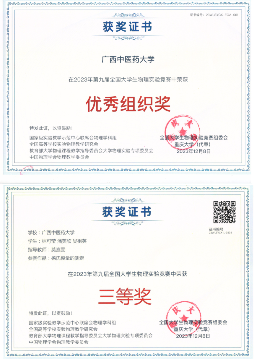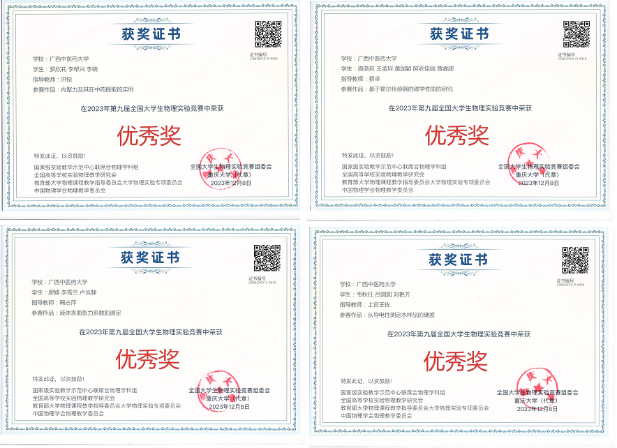 近日,药学院数理教研室指导的五支本科生团队,参加在重庆大学举办的第九届全国大学生物理实验竞赛。本次竞赛有来自全国600余所高校的2251份作品参赛,鸭脖有5支队伍分别参加了命题类创新作品、自选课题类创新作品、物理实验讲课等三个类别的比赛,获得了全国三等奖1项,优秀奖4项及“优秀组织奖”的良好成绩。