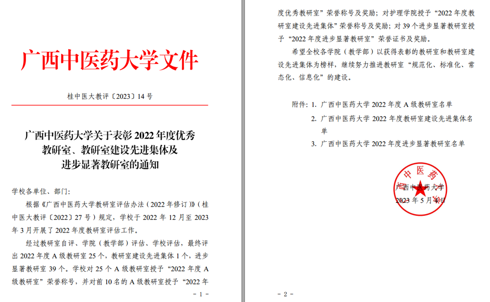 根据《YABO鸭脖教研室评估办法(2022年修订)》(桂中医大教评〔2022〕27号)规定,学校于2022年12月至2023年3月开展了2022年度教研室评估工作。