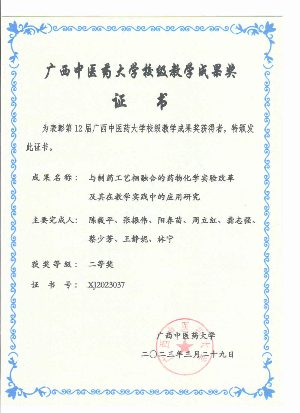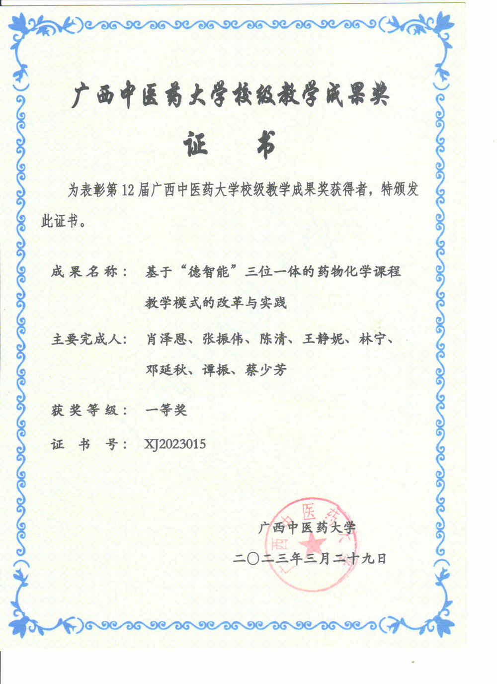 据YABO鸭脖《YABO鸭脖关于公布第十二届校级教学成果奖名单的通知》(桂中医大教评[2023]9号)文件精神,药学院药物化学教研室肖泽恩副教授主持的《基于“德智能”三位一体的药物化学课程教学模式的改革与实践》研究成果荣获一等奖,陈毅平教授主持的《与制药工艺相融合的药物化学实验改革及其在教学实践中的应用研究》研究成果荣获二等奖。此次获奖是本教研室近年来不断进行理论与实践探索的结果,将为本教研室不断提高药学应用型人才培养质量提供更加行之有效的教学经验和方法。