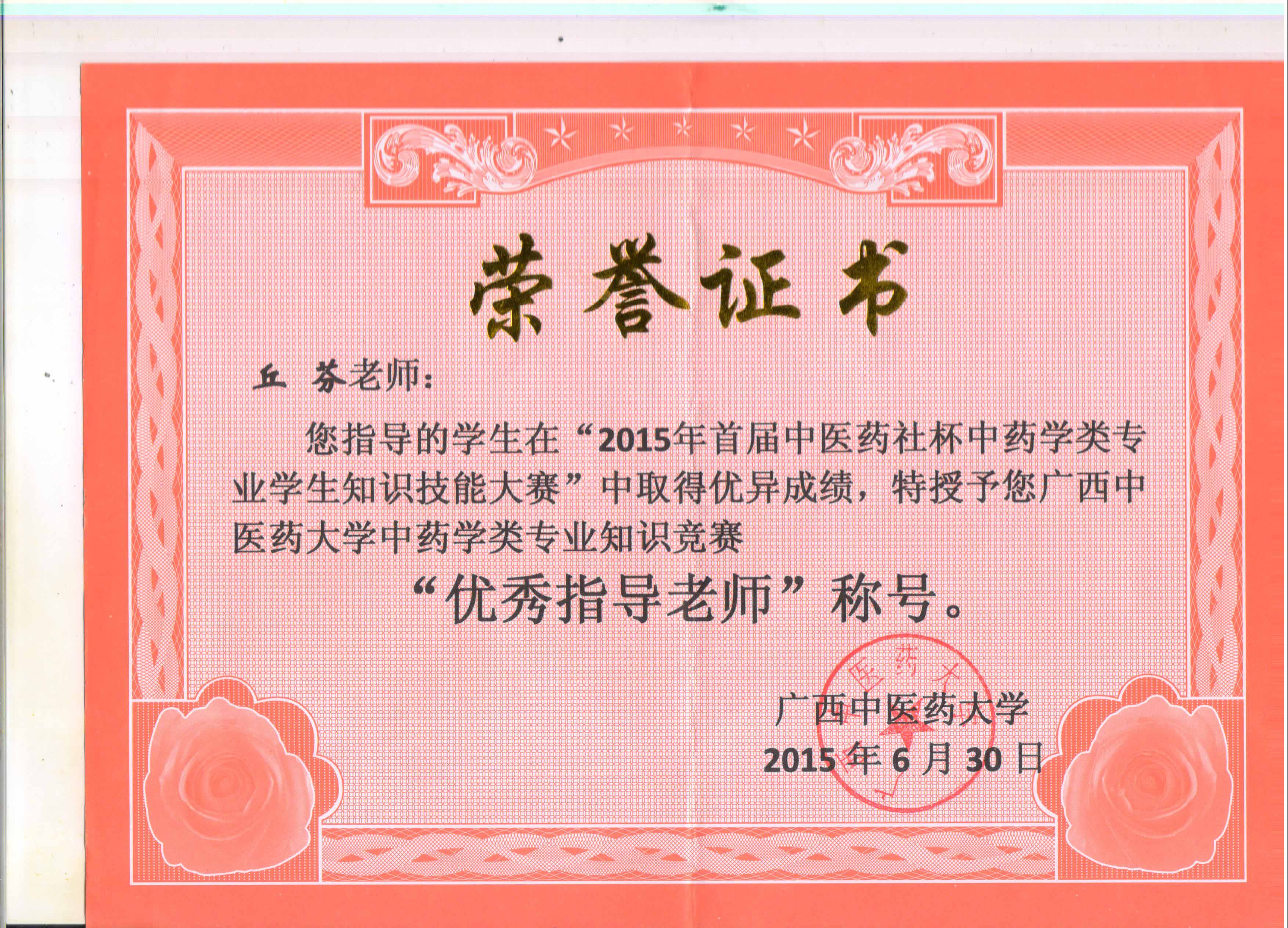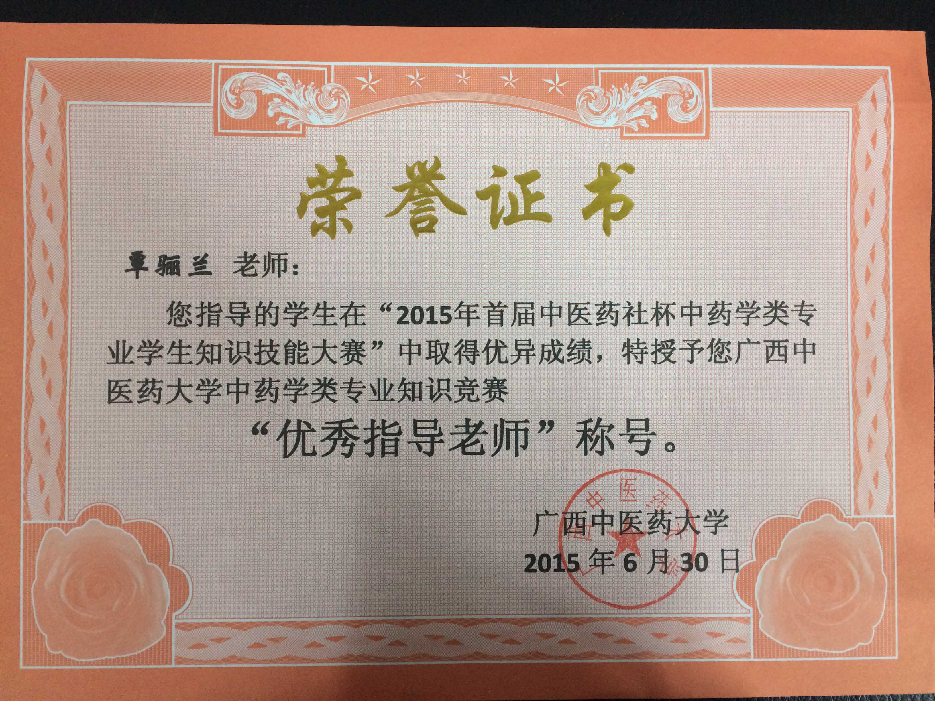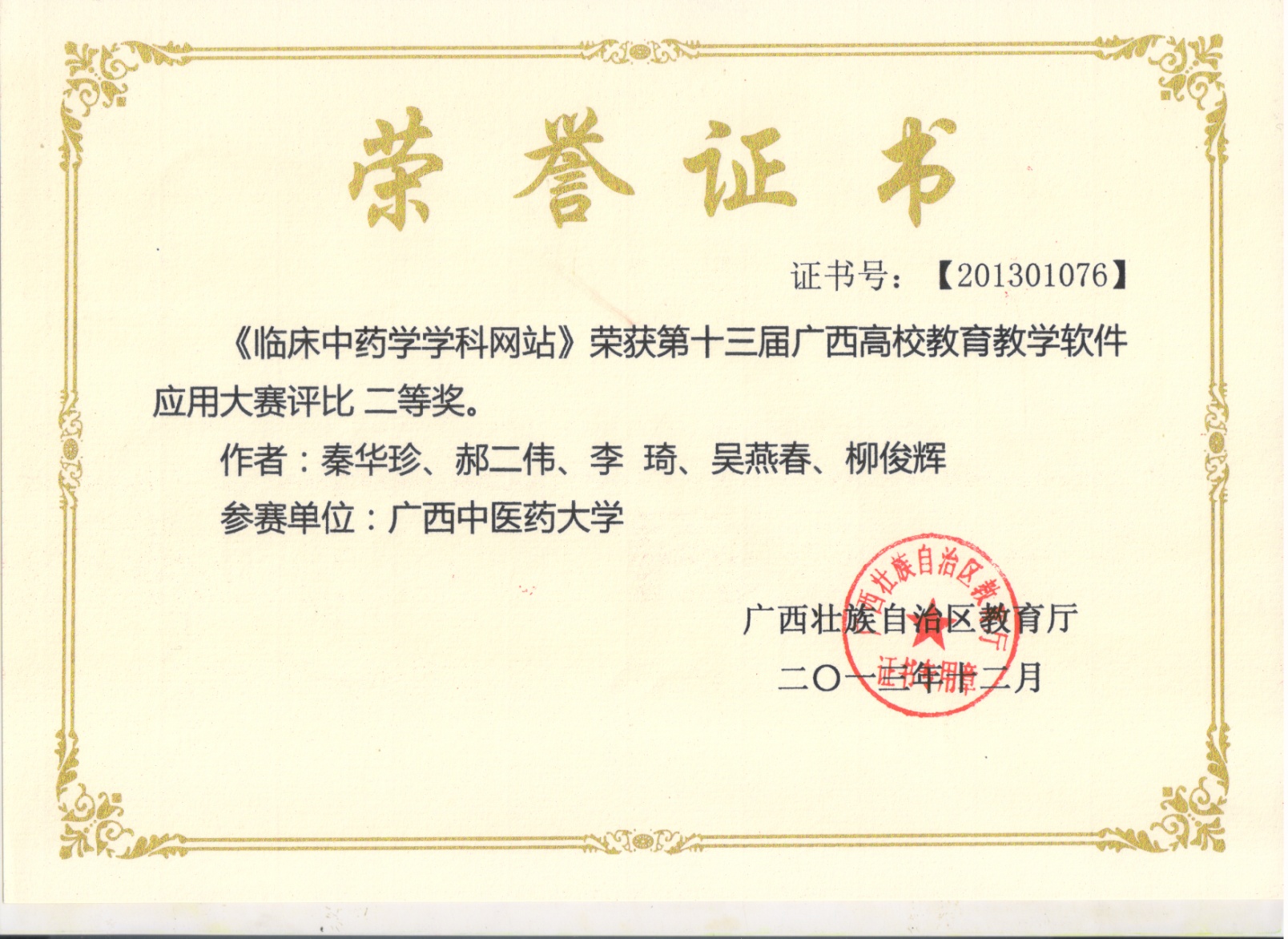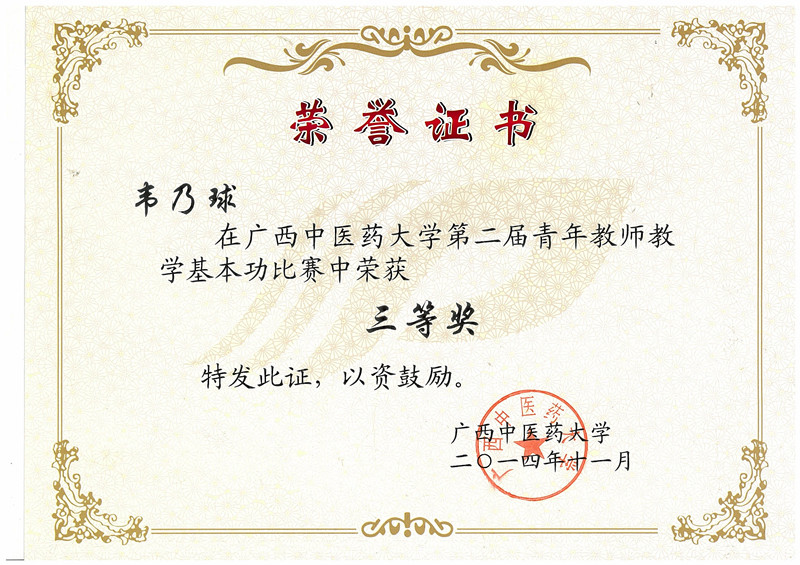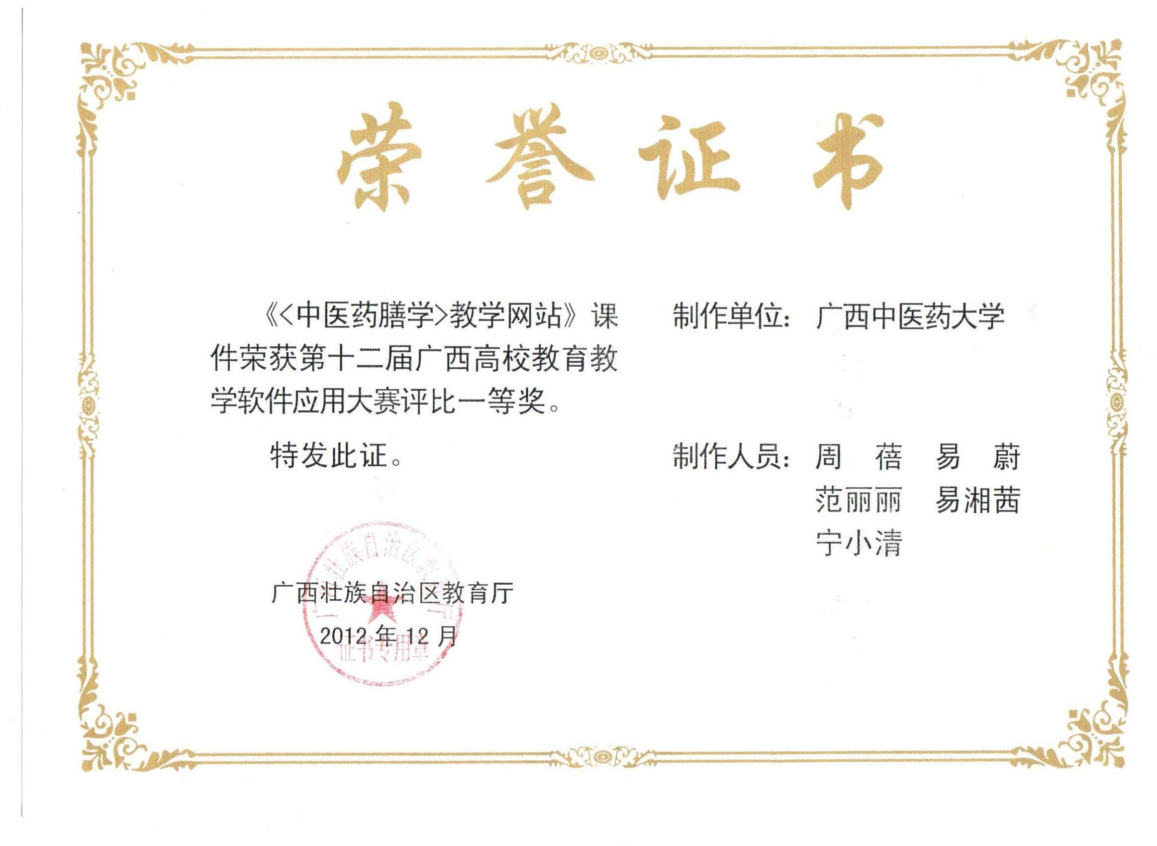 中药教研室获奖证书 发布时间:2017-05-06 17:16:07 浏览次数: 次 【字体:小 大】 《<中医药膳学>教学网站》课件荣获第十二届广西高校教育教学软件应用大赛评比一等奖 覃骊兰老师荣获“优秀指导老师”称号 丘芬老师荣获“优秀指导老师”称号 周蓓同志荣获自然科学应用学科组一等奖 周蓓老师获“中医药社杯”基础初中级组优秀奖 《中医药膳学》在“第十三届全国多媒体课件大赛”中获高教医学组优秀奖 《临床中药学学科网站》荣获第十三届广西高校教育教学软件应用大赛评比二等奖 韦乃球在YABO鸭脖第二届青年教师教学基本功比赛中荣获三等奖 覃骊兰老师荣获第二届“中医药社杯”优秀奖 分享到: 【打印正文】