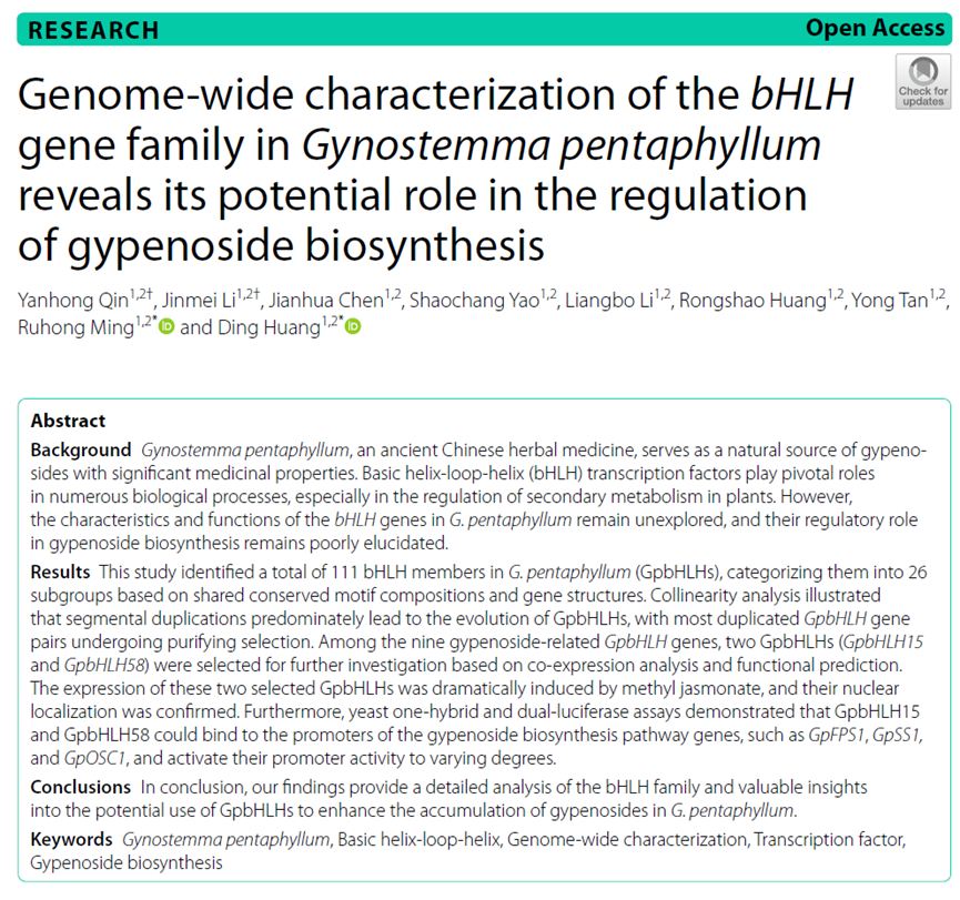 2024年3月20日,BMC Plant Biology在线发表了题为“Genome‑wide characterization of the bHLH gene family in Gynostemma pentaphyllum reveals its potential role in the regulation of gypenoside biosynthesis”的研究论文,解析了bHLH转录因子在调控绞股蓝的功效成分绞股蓝皂苷生物合成的分子机制。药学院研究生覃艳红和李锦枚为共同第一作者,中药资源研究团队成员明如宏和黄鼎副研究员为共同通讯作者。