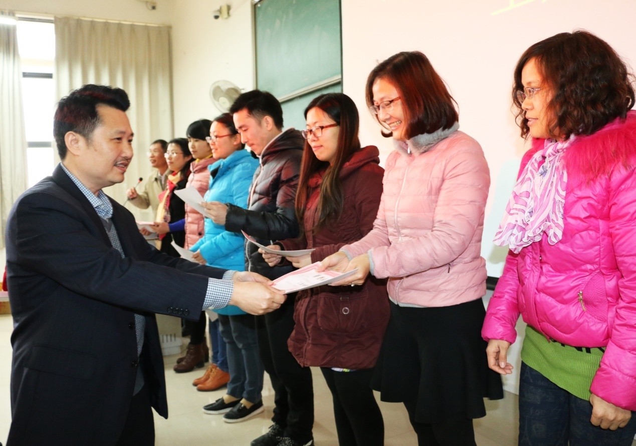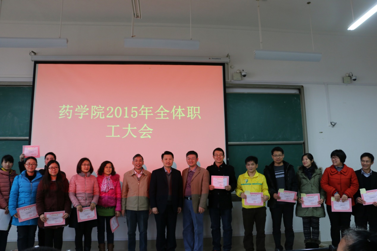 会上,对2015年药学院模范党员、模范教师、美好家庭模范教师、“十佳”班主任、工会积极分子、先进党支部、先进科室等先进个人及集体进行了表彰,庞宇舟副校长给获奖老师颁发了荣誉证书;会议在领导对药学院全体教职工的新春祝福中圆满结束。