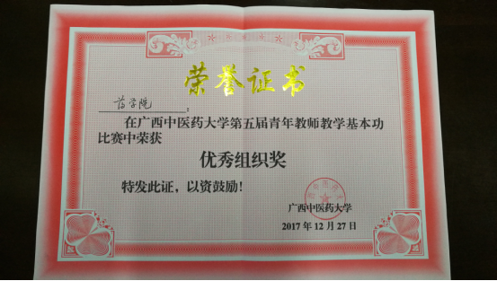 学校第五届青年教师教学基本功比赛于2017年12月27日举行,药学院派出樊兰兰、王静妮、孙健、罗湘四位老师参赛。此次比赛主要对各位老师的教学设计、教学演示及教学反思进行评比,经过一天的激烈角逐,樊兰兰老师获得二等奖,王静妮、孙健老师获得三等奖,罗湘老师获得优秀奖;我院喜获“优秀组织奖”。