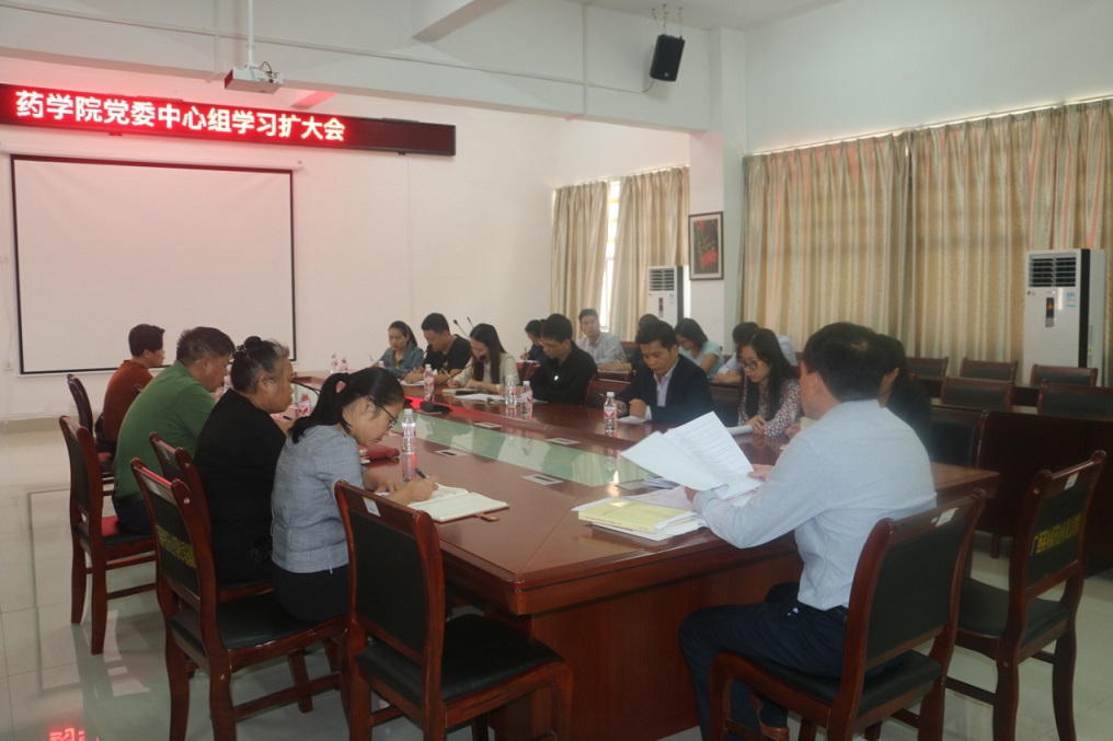 10月11日下午,药学院在会议室A405召开党委中心组学习扩大会。学院党委书记蒋林主持会议,药学院党委委员、支部书记参加会议。