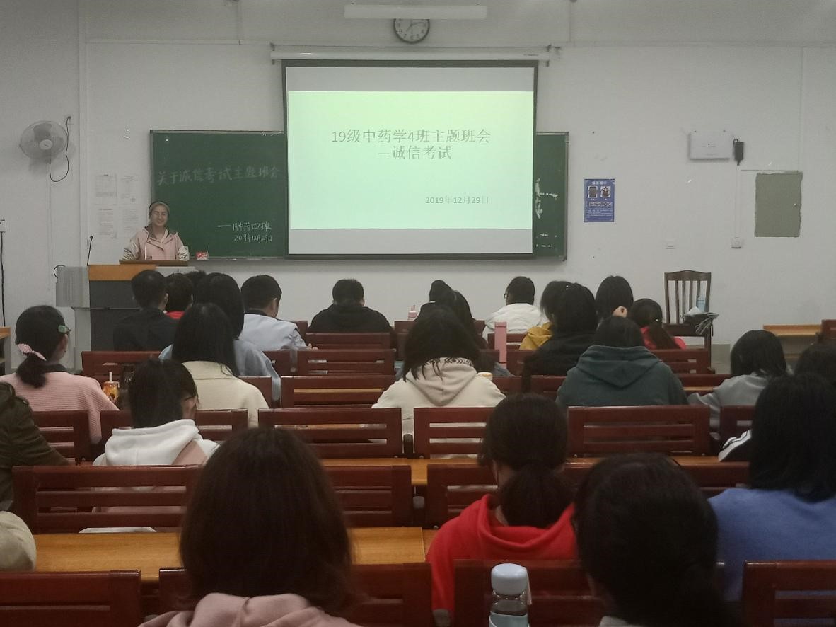 为营造良好班风学风及诚信考试氛围,12月29日晚,药学院2019级中药学、制药工程专业在仙葫校区教学楼分别召开了诚信考试暨班级总结主题班会。参加本次会议的有各班班主任、班助及全体同学。