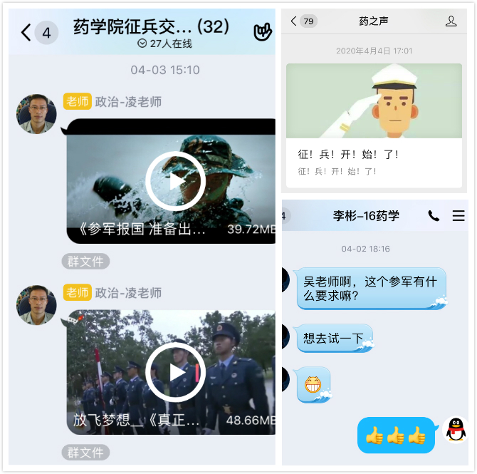 为贯彻落实鸭脖2020年征兵工作会议精神,积极引导在校生参军入伍,4月以来,药学院各年级自上而下开展了一次广泛深入的大学生征兵宣传动员,同学们参军入伍热情高涨,截至目前已有11名男生提交应征意愿。